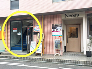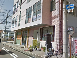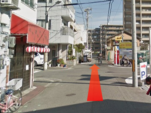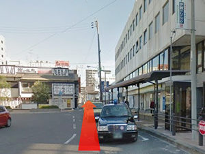 突き当りまで直進し、左前方にあるピンク色の建物です。